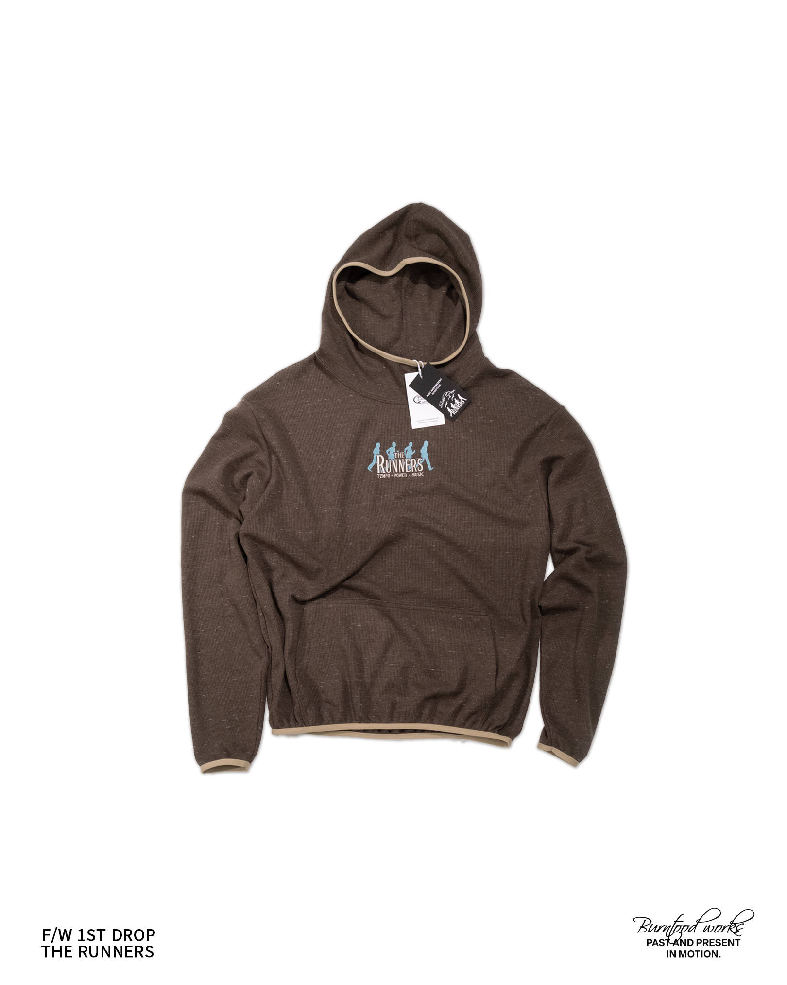 와플소재의 하이넥 후드로 몸판과 라인 배색 포인트