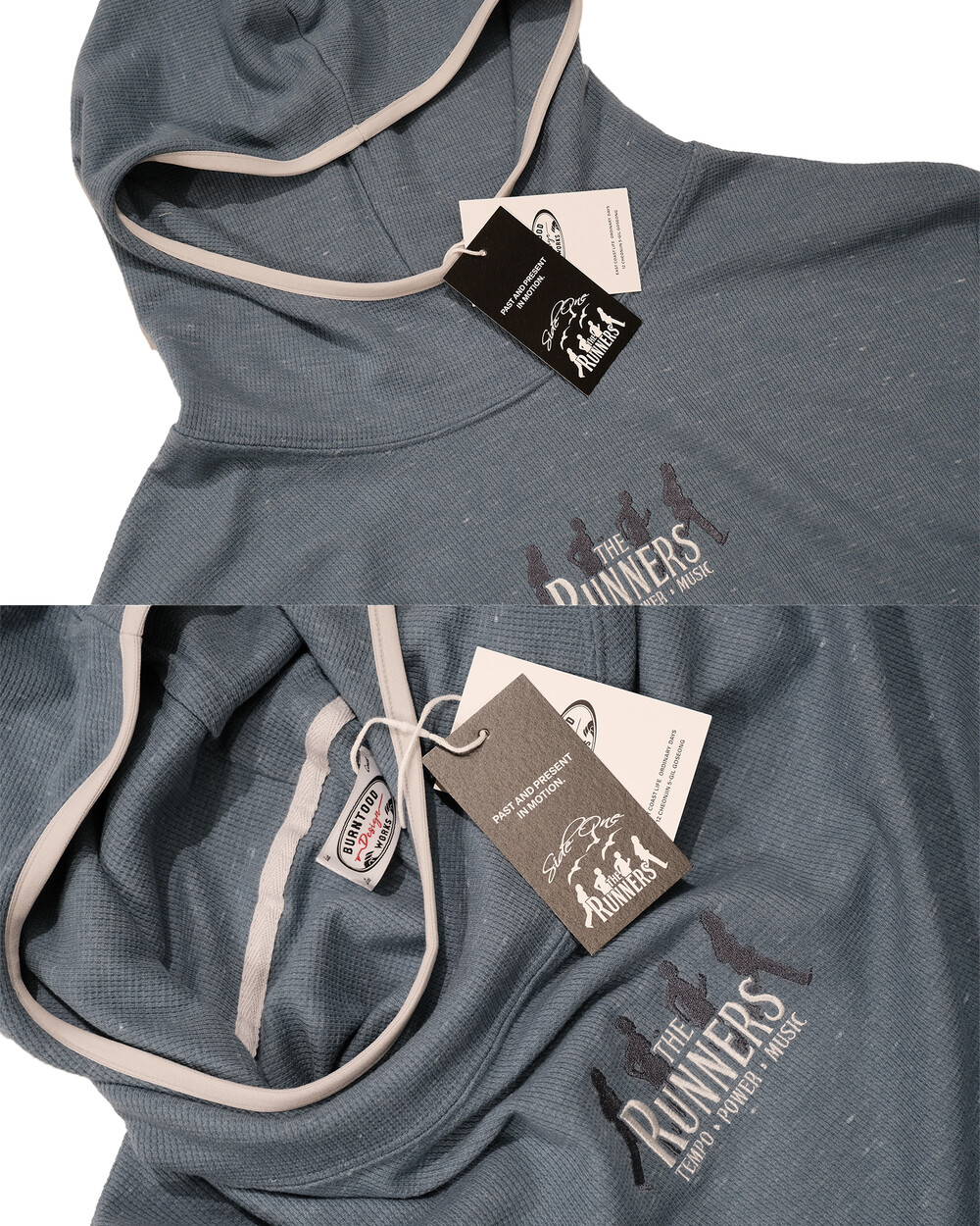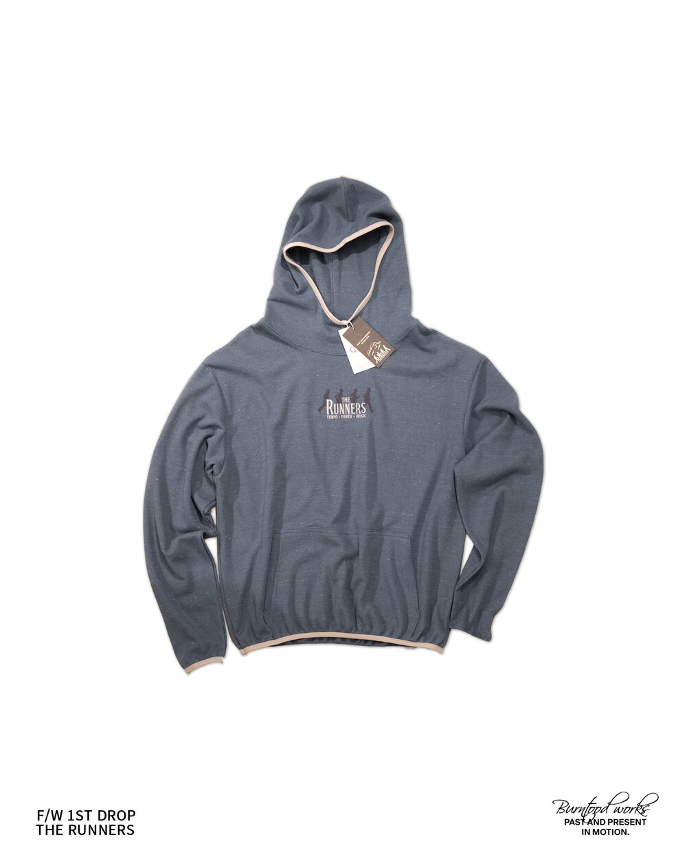 와플소재의 하이넥 후드로 몸판과 라인 배색 포인트